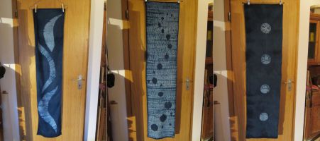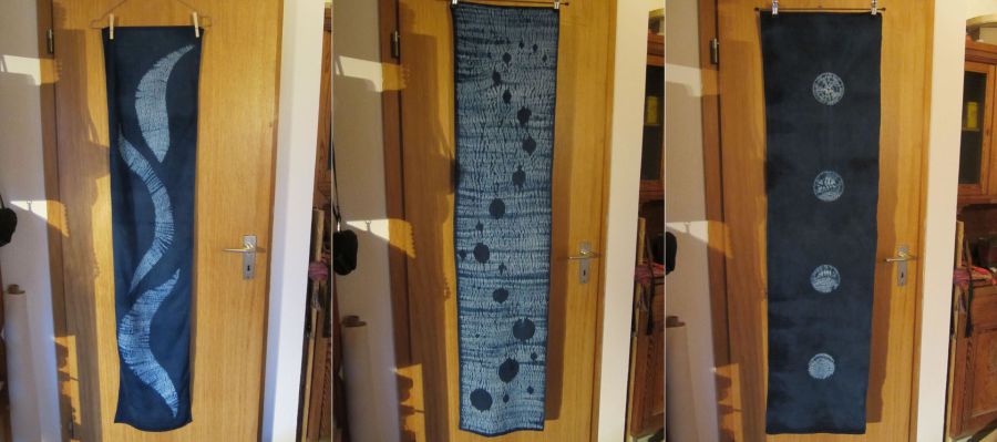 Shibori ist eine japanische Reservierungstechnik, bei der durch Abklemmen, Abbinden oder Abnähen Muster erzeugt werden, die dann mit Indigo überfärbt werden. so dass die Musterung schließlich weiß auf blauem Grund erscheint. Der Reiz an Shibori ist, dass man mit wenigen Musterschritten schon zu einer großen Mustervariation kommen kann. Andererseits können sehr gegenständliche und sehr aufwändige Musterungen ebenfalls erreicht werden. Jede Färbung ist aber ein Unikat.