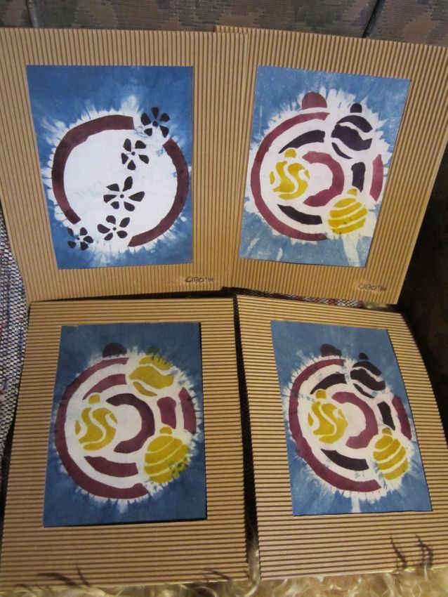 Auf blauem Hintergrund malen oder schablonieren wir mit Erdpigmenten auf Baumwolle oder Leinen. Um gleich in die Färberei einsteigen zu können, bringe ich eine fertige Frucstoseküpe mit. Vor Ort werden wir nur eine kleinere Küpe ansetzen, damit die Teilnehmer*innen die Grundprinzipien selbst sehen können. Danach werden wir die Stoffe mit einfachen Shiboritechniken falten, abbinden oder abklemmen und in der Indigoküpe blau färben. Die ausgesparten Bereiche können dann mit den Erdfarben freihand bemalt werden oder wir können Muster mit Schablonen auftragen.